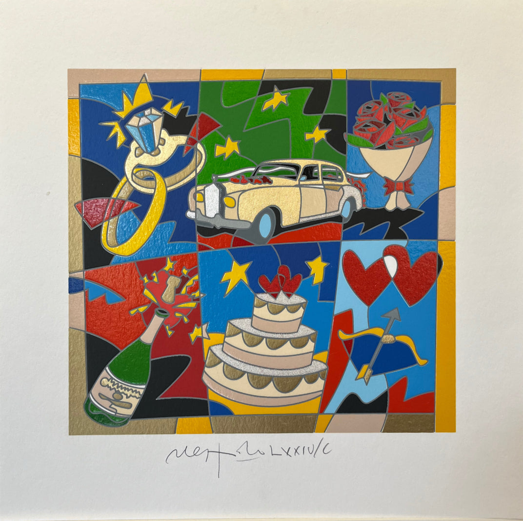 Serigrafia a 38 passaggi di colore con interventi in glitter, foglia oro, foglia argento floccaggi e passaggio calcografico a secco